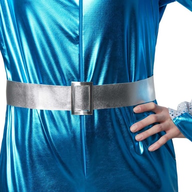 Damekostymen strålende Disco Starlet består av en del i neonblå, blank tekstil. Et stort glidelås midt framme gjør at den er lett å ta på. Dyp v-hals og aktuell krage i 70-tallsstil. Armer og buksebein med mye vidde. Buksebeinene har en pyntebord i knehøyde. Kragen og innleggene på armer og bein er i gjennomsiktig, lysegrå tekstil med sølvfarget tråd. Her sitter paljettlignende, sølvfargede, blanke punkter. Sølvfarget belte med beltespenne farget i rustfritt stål følger med i leveransen, materiale: 95% polyester, 5% elastan.