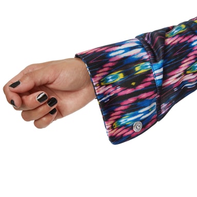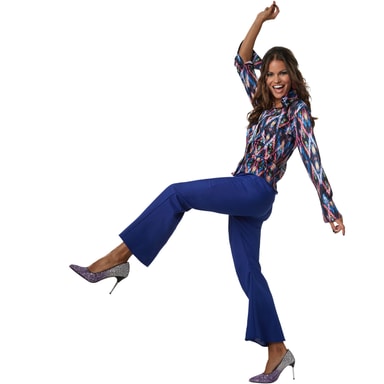 Dykk ned i de herlig glorete 70-årene: Allsidige farger, foldesøm og slengbukse setter tonen på dansegulvet. Som diskodronning holder du rytmen perfekt. Dette figurvennlige antrekket med markert knappelist og vide bein tiltrekker seg alles oppmerksomhet.