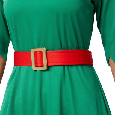 Selv om temperaturen på Nordpolen er iskald, er antrekket til den festlige julealven ganske så luftig. Det er ikke så rart, for det er mye arbeid som venter alle de involverte. For det er jo slik at alle de små – og store «kundene» til Julenissen ønsker å få gaven sin i tide. Den korte, grønne satengkjolen til julealven har en taggete kant nederst og på de halvlange ermene. En glidelås på ryggen gjør det lettere å ta på seg plagget. Stoffinnsatsen rundt halsen så vel som underskjørtet er rødt og har også et taggete mønster. Hvite pyntedusker pryder taggene på kanten og rundt utringningen. For å få en perfekt passform kan man justere det røde beltet med den gylne spennen, materiale: 100 % polyester.
