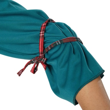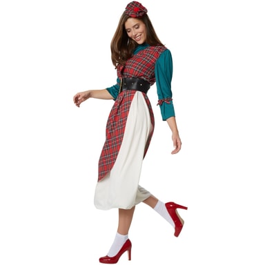 Damekostymet «Fornem highlanderdame» består av en rutete, ermeløs kjole, med folder og splitt på sidene. Midjen er visuelt adskilt med en strikk. Draktens overdel er asymmetrisk splittet og sammensydd på utringningen.Les mer om produktet