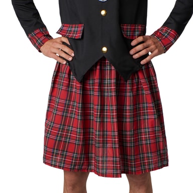 Herrekostymet «Fornem skotte» består av en kilt med strikk og knestrømper med sløyfer i tillegg til en langermet jakke med skulderkappe, gylne knapper og borrelås. De antydede lommene så vel som mansjettene har rutemønster, skulderkappene har gullpynt. Den store blondekragen festes med borrelås. En skottelue i rutemønster med strikk gjør kostymet komplett, materiale: 100 % polyester.