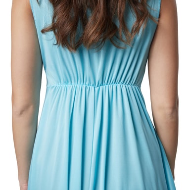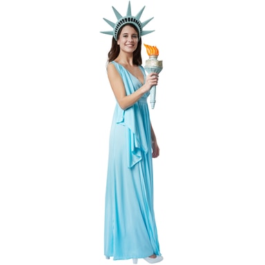 Den ermeløse,ensfargede damekostymen Frihetsgudinne er laget av lyseblått, blank tekstil. Den dype-utringningen framhever brystet på en fin måte. Under brystet sitter et gummistrikk. Forkleet som er festet på kjolen er like lang som selve kjolen, og tekstilstykket som er sydd fast på høyre skulder kompletterer den fine kostymen, materiale: 100 % polyester.