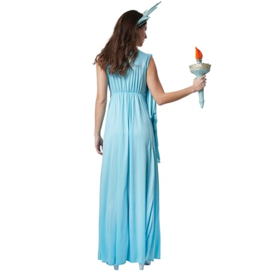 Den ermeløse,ensfargede damekostymen Frihetsgudinne er laget av lyseblått, blank tekstil. Den dype-utringningen framhever brystet på en fin måte. Under brystet sitter et gummistrikk. Forkleet som er festet på kjolen er like lang som selve kjolen, og tekstilstykket som er sydd fast på høyre skulder kompletterer den fine kostymen, materiale: 100 % polyester.