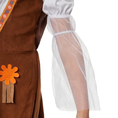 Jentekostymen Groovy Hippie Squaw består av en kort kjole med påsydd, ermeløs vest i semsket skinn. De korte ermene har gummistrikk og munner ut i en trompetformet del i tyll. Halsåpningen har også gummistrikk.Les mer om produktet