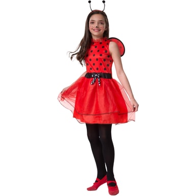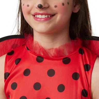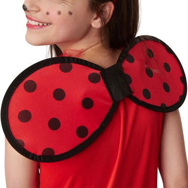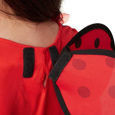 Jentekostymet Lille lykkebringer Mariella består av en kort kjole, vinger og et hårbånd. Den røde kjolen med svarte prikker er uten ermer og har tyllrysjer på kragen. Midjen er prydet med en svart sløyfe med hvite prikker. Skjørtet har tre lag, begge overskjørtene er av tyll og har en smal, svart kant nederst. Kostymet lukkes med borrelås i nakken. De prikkete vingene i rødt og svart blir også festet i ryggen med borrelås. Det matchende pannebåndet i rødt med svarte følehorn fullfører kostymet, materiale: 100% polyester.