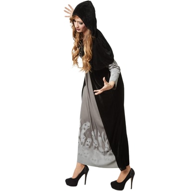 Damekostymen mektig magiker består av en ankellang kjole i svart fløyel med et grått innlegg på ermene og fra brystet og ned til skjørtekanten. Ermene og nedre del av skjørtet har trykk med hvite spøkelsesansikter. Kjolen har snøring fra brystet og ned til midjen. Kostymen kompletteres av en kort fløyelscape med hette og snøring, materiale: 100 % polyester