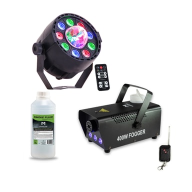 Dette bundle består av 1 x LED PAR-ASTRO 2-i-1 Diskolys, 1 400W RGB Røykmaskin samt 1L røykvæske.