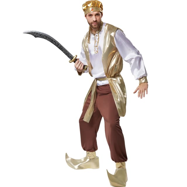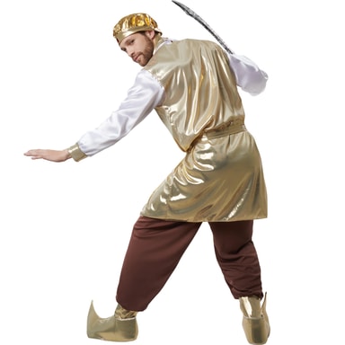 Mannekostymen Prektig sultan består av lange bukser med gummistrikk og gyllen avslutning. Den langermede overdelen har knapper nedover ved halsen innrammet av en gyllen bord med rysjer. Selve kragen er i gull. Kostymen har borrelås i nakken. Også ermene er gylne ytterst. Alt av accessoire er i gull: En ermeløs kittel, et par kalosjer med karakteristisk spiss, magebelte og hodeplagg med gummistrikk, to bånd bak og en edelstein foran gjør kostymen perfekt, materiale: 100 % polyester
