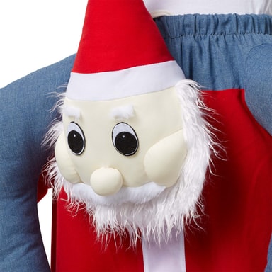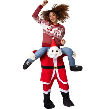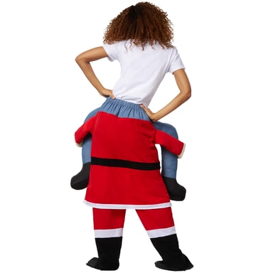 For en ære: I ri-på-ryggen-kostymet formet som en nisse bærer den sympatiske gavebringeren fra Nordpolen deg på skuldrene sine. Antrekket har form som en klassisk julenisse og er enkelt å smette på seg. Bukse og sko er påsydd. De uekte bena og skoene er stoppet og virker dermed mer ekte. Også det vakkert formede hodet til nissen er stoppet. Gjennom de påsydde oppbrettene på foten forsvinner ens egne ben sammen med skoene under kostymet. Den elastiske linningen med trekksnor garanterer at antrekket sitter perfekt og komfortabelt, materiale: 100 % polyester.