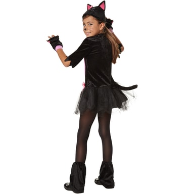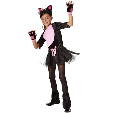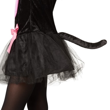 Den søte jentekostymen rosa pusekatt består av en kort kjole med dobbelt skjørt i tyll og sateng. På skjørtet sitter en rosa sløyfe. Overdelen er laget av svart plysj med en rosafarget del på magen og brystet. Ermene er frynset. Kjolen lukkes med en glidelås på ryggen. På enden av glidelåset sitter en kattehale med innfelt, bøyelig vaier. Den svarte kattemasken har ører og ansikt. Ørenes innside, nesen og sløyfen er rosa. Svarte benmansjetter og svarte, fingerløse plysjhansker med rosafargede poter og rosa bånd kompletterer kostymet, materiale: 100 % polyester.