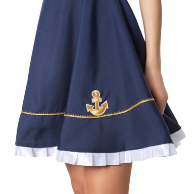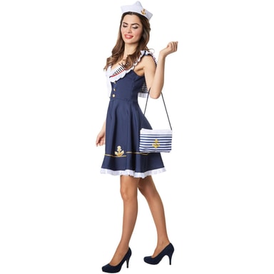 Damekostymet sjømannsbruden består av en kjole og en hatt. Den marineblå kjole har en glidelås og er ermeløs og med kort snitt. Den sjenerøse halsen er hvit og ruffled, med en rød hem og en svart og hvit stripet stoffinnsats, som gir inntrykk av den typiske sjømannskragen. I området av décolleté er en syd stoffinnsats med en knute. Det litt utstedte skjørtet har seks gyldne dekorative knapper fordelt på to rader i den øvre delen. I nedre del er en gylden dekorsøm og et gyldent anker sydd på, som en avslutning dannes en hvit, stryket ornamental søm. Hatten med gyllenankerplaten setter prikken over i’en på kostymet, materiale: 100% polyester.