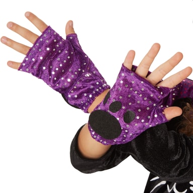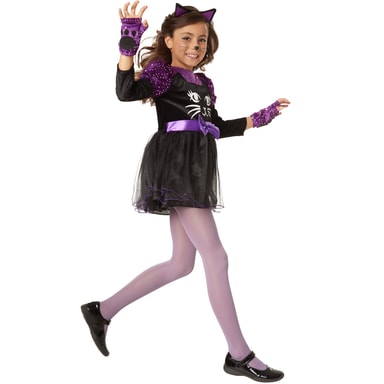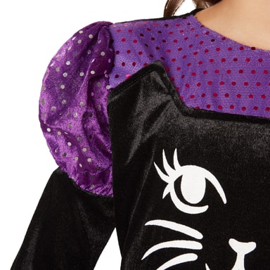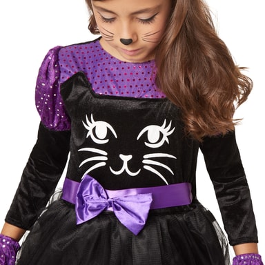 Den nydelige jentekostymen søt kosekatt har et lekent utseende med mange fine detaljer. Kjolen består av en del med trelags skjørt i tyll og sateng. De to ytterste svarte tyllskjørtene har lilla sømmer. Den forseggjorte overdelen med lange armer er hovedsaklig i svart fløyel, og fremre del er formet som et kattehode med hvite, påtrykte øyne, nese og værhår. Et lilla bånd med sløyfe skiller den øvre delen fra skjørtet. Utringningen har en lilla del i tekstil med rosa prikker. Skuldrene er i lillafarget fløyel med sølvfargede prikker. Armene er i svart plysj. Kostymet lukkes med en glidelås på ryggen. Nederst sitter en kattehale med innebygget, bøyelig vaier som kan bøyes etter eget ønske. Kostymet kompletteres med fingerløse hansker og hårtilbehør med kattører. Den hansker er lilla med sølvfargede prikker og svarte poter, materiale: 100 % polyester.