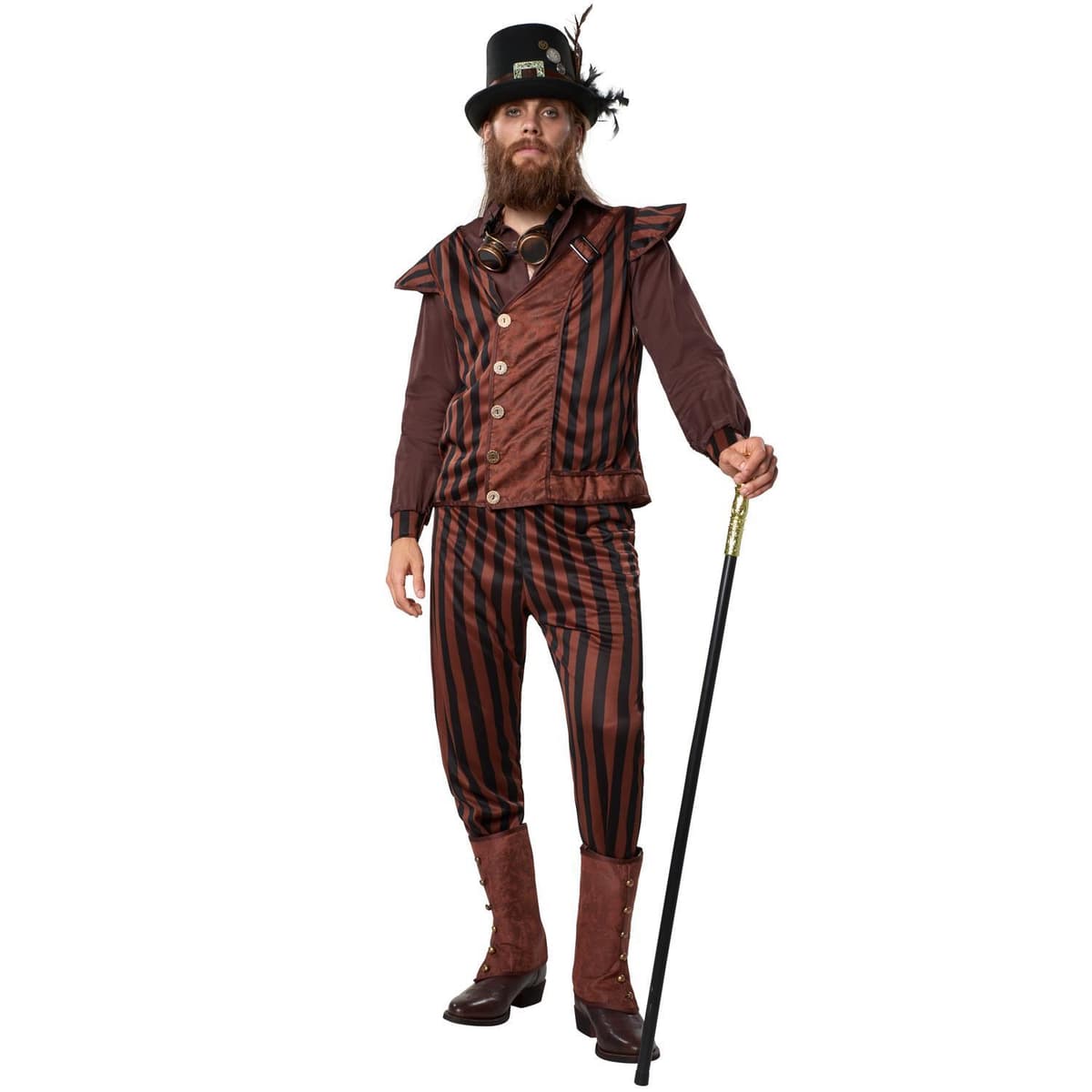 Herrekostymet «Steampunk-gentleman» består av en lang, stripete bukse av sateng og støvelmansjetter med en look i semsket skinn. Den langermede skjorten har knapper og krage. Mansjettene matcher den stripete looken til buksene. Den ermeløse vesten med epåletter har også stripemønster. Den kan kneppes og har et innlegg i semsket skinn med spenne, materiale: 100 % polyester.