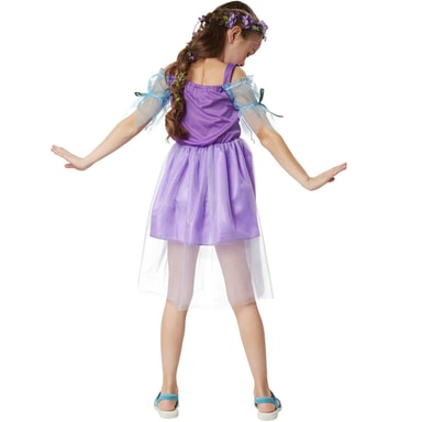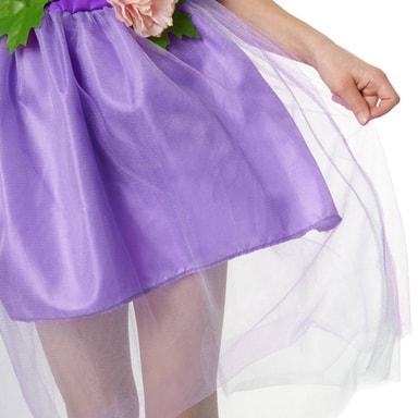 Jentekostymen Trylleblomst fe består av en stroppekjole med gummistrikk på kragen og i midjen , korte ermer i tyll, påsydd snøring samt blad og blomster i midjen. Det korte skjørtet har et langt overkast i tyll, materiale: 100 % polyester