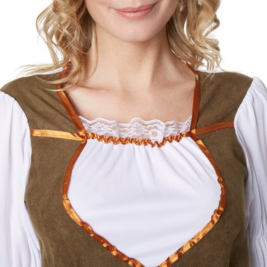 Damekostymet tyvenes dronning består av en kort kjole og en hatt. Kjole er hvit med grønnbrune innsatser i velour og brun sateng på kragen, armer, forkle og skjørt. På baksiden er det festet et gummistrikk. Skjørtdelen er kort foran og lang bak.Les mer om produktet