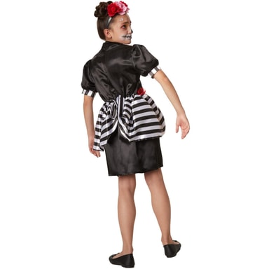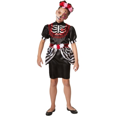 Jentekostymen nifs skjelettdame har korte armer med skjelettrykk på utringningen, krage og svart- og hvitstripet bånd på ermene. På skjelettmønsteret sitter en rød tyllkant. Røde og hvite påsydde blomster danner et belte.Les mer om produktet