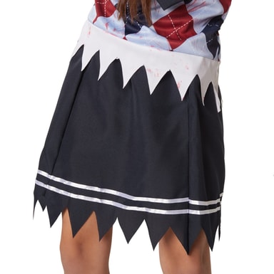Jentekostymen nifs skolejente med tre deler består av en overdel, skjørt og slips som festes med et gummistrikk. Overdelen består av en del. Blusen med påsydd, rutet, rød vest har frynsede sømmer og armer. Både kragen og overdelen har blodflekker.Les mer om produktet