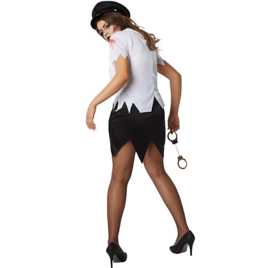 Damekostymet «Uhyggelig politidame» består av et trevlete, kort skjørt med strikk og likeledes av en trevlete, kortermet overdel med trevlete slips og krage. Overalt er det trykk med blodflekker. I nakkehøyde er det en borrelås, nettingstrømper følger med, materiale: 100 % polyester.