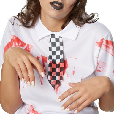 Damekostymet «Uhyggelig politidame» består av et trevlete, kort skjørt med strikk og likeledes av en trevlete, kortermet overdel med trevlete slips og krage. Overalt er det trykk med blodflekker. I nakkehøyde er det en borrelås, nettingstrømper følger med, materiale: 100 % polyester.