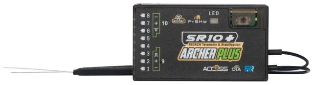 Frsky SR10+ er en 10-kanals mottaker med innebygget 3-akset gyro og akselerometer for å stabilisere modellfly under flyving. Kan også brukes som redundancy mottaker sammen med andre FrSky ACCESS&ACCST-mottakere med SBUS-port.