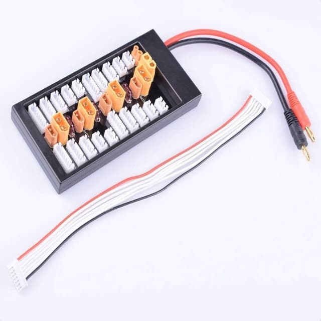 Multiladebrett for 1-6s LiPo-batterier, gir deg mulighet til å lade opp til 4 batterier samtidig på samme lader. Brettet fungerer ved å koble batteriene i parallell slik at laderen håndterer dem som ett stort batteri. Brettet har 40A sikring mellom utgangene (ikke balanseringsutgang). Brettet er beregnet for batterier med XH balanseringskontakt og XT30 /XT60 strømkontakter og kobles til laderen med 4mm bullet. Batteriene som skal lades må være like, likt utladet og ha samme antall celler.