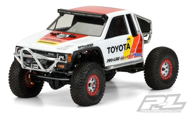 Ulakkert lisensiert Toyota Hilux SR5 karosseri fra Proline. Passer f. eks Axial SCX10. NB! Dette er kun førerhuset, selve lasteplanen og annet skalautstyr på bildet medfølger ikke. Passer til * Axial SCX10 Trail Honcho Spesifikasjoner * Skala: 1/10 * Lengde: 287 mm * Bredde: 203 mm * Høyde: 133 mm Medfølger * Ulakkert 1985 Toyota® HiLux SR5 Clear Cab * Decal set * Vindu maskering * Paint-then-peel overspray film