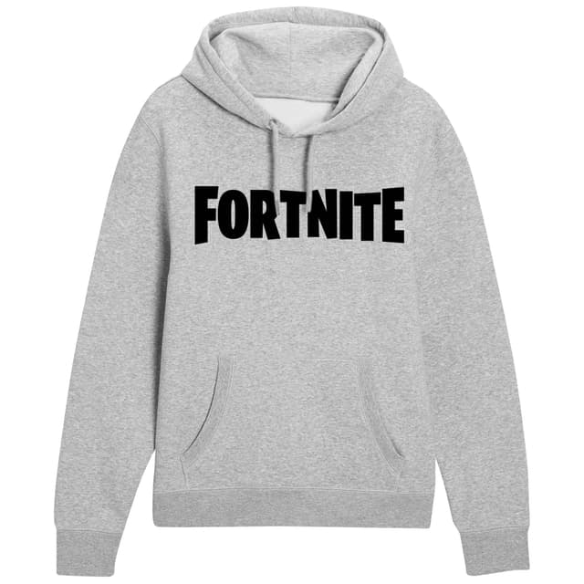 Grey hoodie with Fortnite logo on the front. Size S, equivalent to the European size 48.