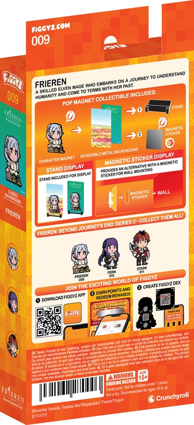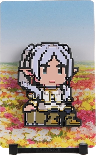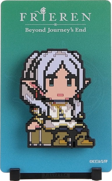 First 4 Figures Figgyz Frieren Magnet actionfigur har en vendbar bakplate i metall som gir to visningsalternativer, en figur i pikselkunststil, magnetisk 3D-pop-out-effekt, en display-base og et magnetisk klistremerke.