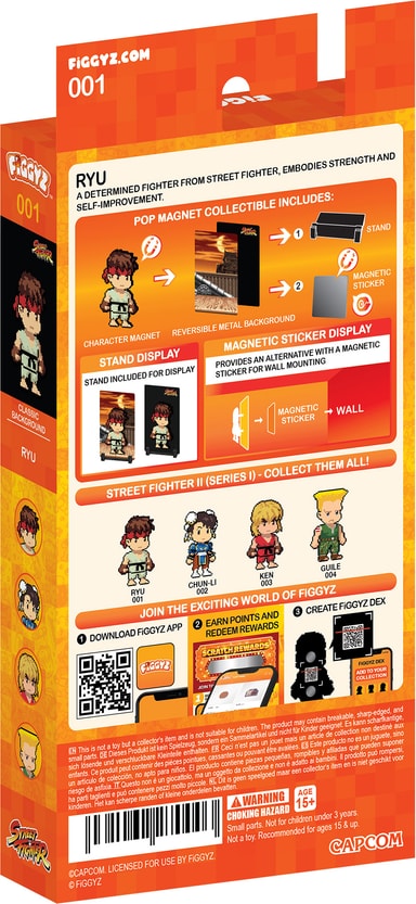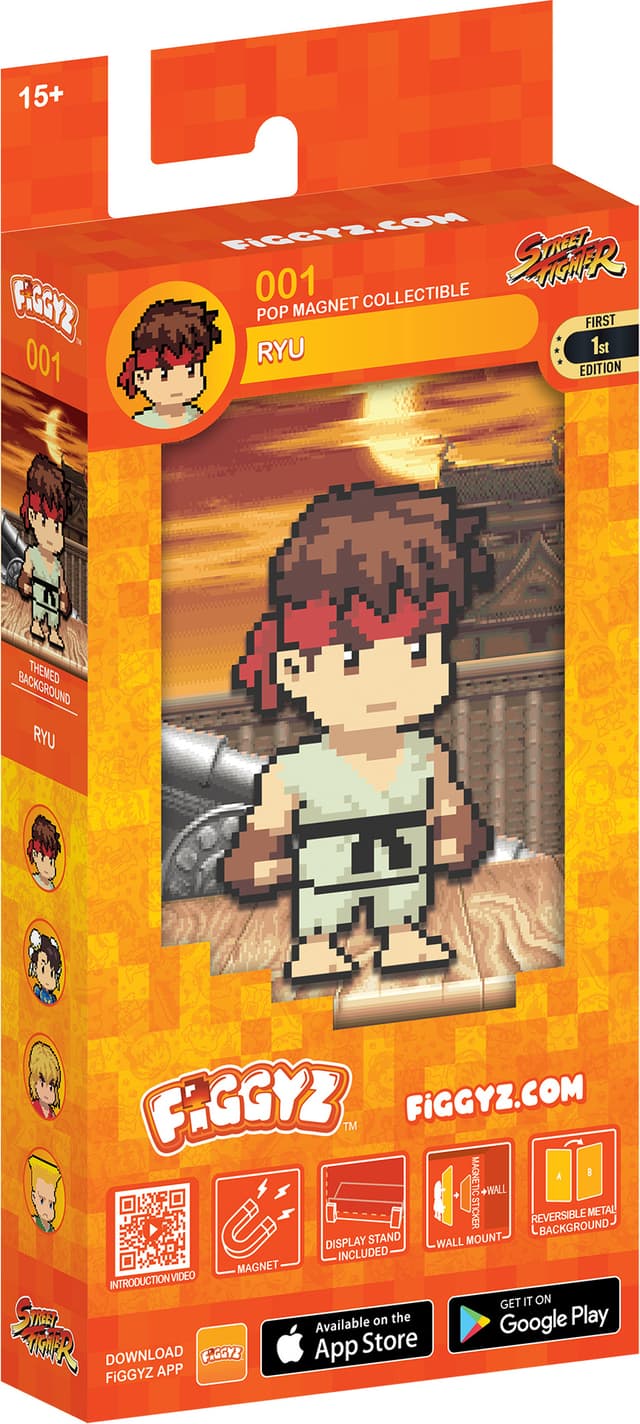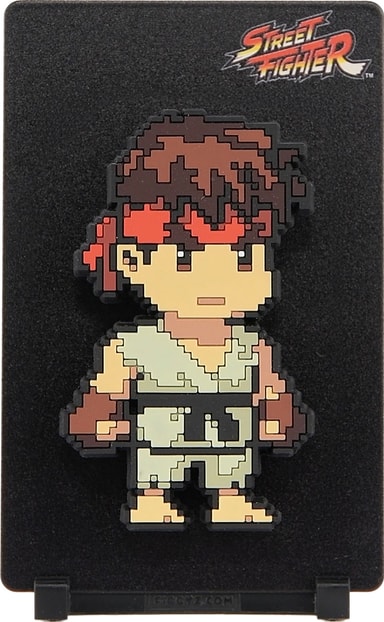 First 4 Figures Figgyz Street Fighter 2 Pop Magnet actionfigur har en reversibel bakplate av metall for to visningsmuligheter, en piksel-stilart karakter, en 3D-magnetisk pop-ut effekt, visningsbase og et magnetisk klistremerke.