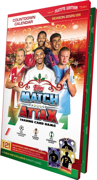 Topps Match Attax Champions League adventskalender inneholder 97 Match Attax-kort, inkludert 24 eksklusive Festive/Squadzone-kort og et garantert eksklusivt Limited Edition-kort. Den inneholder en daglig quiz/aktivitet.Les mer om produktet
