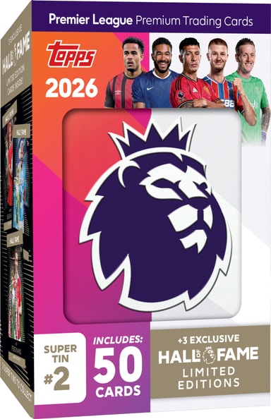 Topps Premier League Super Tin samlekort inneholder 50 kort med 3 garanterte Exclusive Limited Edition-kort, ofte Hall of Fame LE-kort. Boksen gir også en sjanse til å finne en sjelden Chrome King Gemstone Parallel.Les mer om produktet