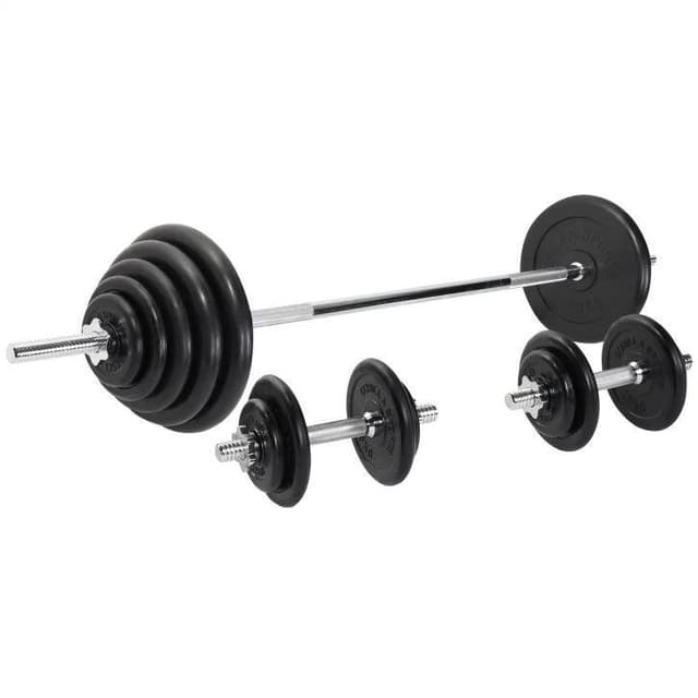 Vektstangpakke med vektstang på 10 kg og 170 cm og to hantelstenger på 35 cm hver med en totalvekt på 5 kg. Vektstang + manualsett Totalt 100 kg I pakken er det 18 vektskiver som sammen med stengene veier 100 kg. Hvis du vil, kan du få vektstangen til å veie 92,5 kg på det meste, mens du kan få en hantelstang til å veie 52,5 kg, alternativt en vekt på 10 kg for begge manualstengene samtidig. Vektskivene, som er laget av støpejern, har et sort gummibelegg som hindrer riper og skader på både gulv og vektskive.. Ønsker du å komplettere ditt sett med vektskiver, finner du tilsvarende HER. Pakken Vektskiver 6x1,25kg Vektskiver 6x2,5kg Vektskiver 2x5kg Vektskiver 2x10kg Vektskiver 2x15kg To hantelstenger En vektstang Vektskiver Vektskiver 6x1,25kg - Diameter 14,5cm, bredde 2,5cm Vektskiver 6x2,5kg - Diameter 19cm, bredde 2,5cm Vektskiver 2x5kg - Diameter 22,5cm, bredde 3,5cm Vektskiver 2x10kg - Diameter 27,5cm, bredde 3,7cm Vektskiver 2x15kg - Diameter 33,5cm, bredde 4,7cm Hulldiameter: 31mm Vektstang Areal for vektskiver: 31,1 cm per side Maks belastning: 200 kg Greplengde: 107cm Diameter: 30mm To låsekrager Lengde: 170 cm Vekt: 10 kg Hantelstenger Areal for vektskiver: 10 cm per side Maks belastning: 100 kg Greplengde: 13cm Diameter: 30mm Fire låsekrager Lengde: 35 cm Vekt: 2x2,5kg