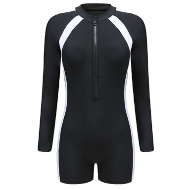 Svart og hvit langermet badedrakt i ett stykke for kvinner med innebygde avtakbare brystputer og en praktisk glidelåsdesign. Gir solbeskyttelse og en flatterende passform. Perfekt for svømming og vannsport.Les mer om produktet