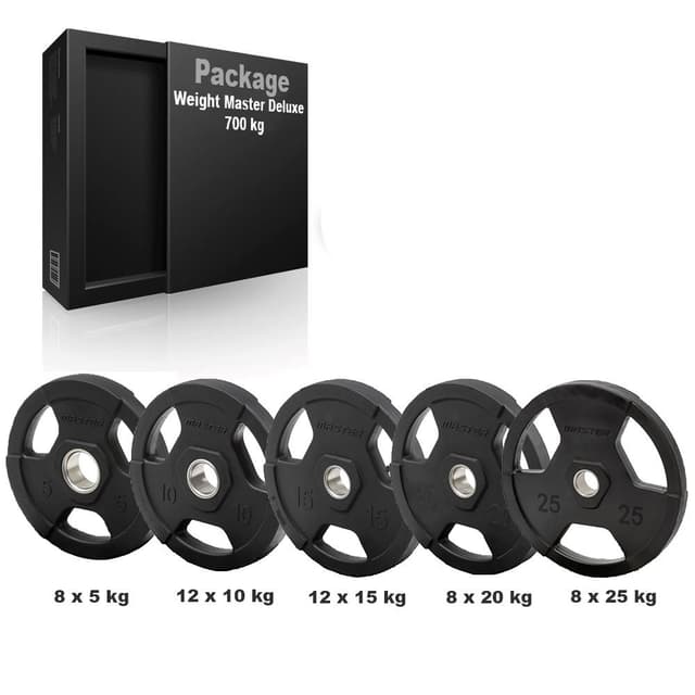 700 kg vektpakke med Master Fitness' populære gummibelagte støpejernsplater med gripende håndtak. For 50 mm vektstang. Disse vektskivene er laget for å brukes til treningsformål og har derfor større feilmargin sammenlignet med vektskiver laget for bruk i konkurranser. Feilmarginen gjelder vekt, tykkelse og diameter. Vekter inkludert: 8 x 5 kg 12 x 10 kg 12 x 15 kg 8 x 20 kg 8 x 25 kg