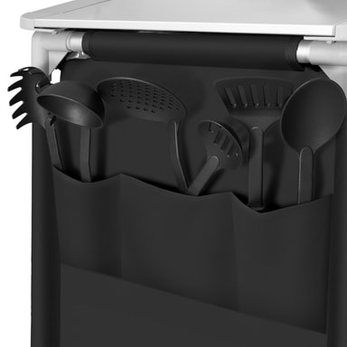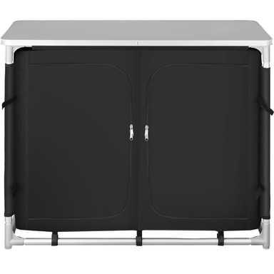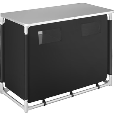 Det praktiske campingskapet fra tectake har stor oppbevaringsplass men tar liten plass. Det er enkelt og fort gjort å montere og demontere skapet. Kjøkkenboksen er utstyrt med en robust arbeidsflate og seks store oppbevaringsrom. Nettingen på baksiden sørger for god lufting. Føttene kan justeres separat slik at kjøkkenet står stabilt uansett underlag. Med dette romslige campingskapet fra tectake har du full kontroll på matlagingen også ute under åpen himmel.