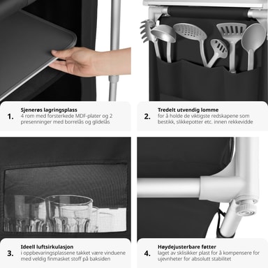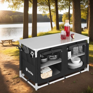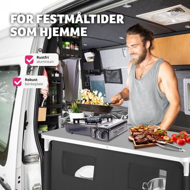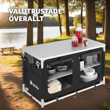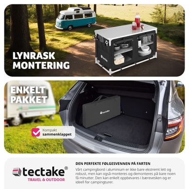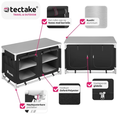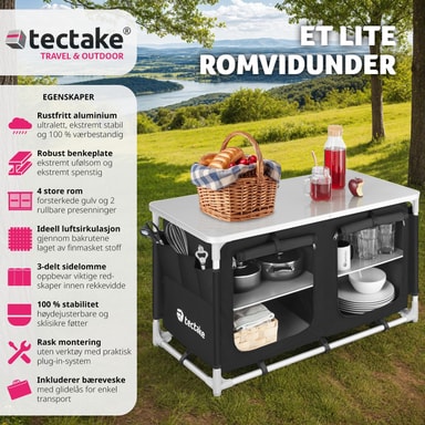 Det stabile campingkjøkkenet fra tectake er perfekt til din neste campingtur. Arbeidsflaten og de fire oppbevaringsrommene med innvendige plater i aluminium og netting, som sørger for god luftsirkulasjon, har god plass til kjøkkenutstyr. I den tredelte utvendige lommen på skapet kan du oppbevare mindre deler, som for eksempel bestikk. Siden de fire føttene på kjøkkenboksen kan justeres i høyden spiller det ingen rolle om underlaget er ujevnt. Lett å montere, kan pakkes kompakt: Det sammenleggbare campingkjøkkenet fra tectake passer perfekt til all slags bruk utendørs.