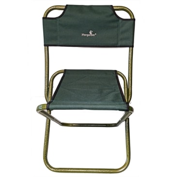 Utendørs sammenleggbar stol med ryggstøtte av merket Merganser. Slitesterk og behagelig. Stolen foldes og foldes ut på sekunder.