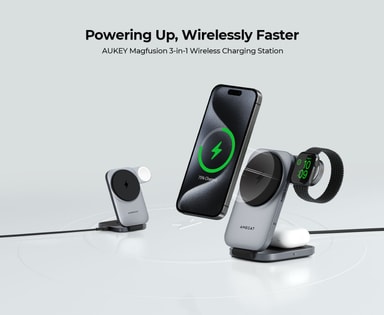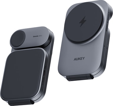 Aukey 3-i-1 trådløs lader gir Qi2-sertifisert hurtiglading med 15W effekt, utviklet for iPhone, AirPods og Apple Watch. Den har et sammenleggbart design, MagSafe-kompatibilitet og USB-C-inngang for enkel bruk og portabilitet.Les mer om produktet