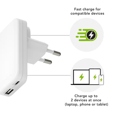dbramante1928 Recharge Pro USB-C/USB-A lader tilbyr slankt design, 30 W USB-C- og 30 W USB-A-hurtiglading med GaN-teknologi, beskyttelse mot overoppheting og kompatibilitet med to plugger, og støtter de beste protokollene for effektiv strømlevering.Les mer om produktet