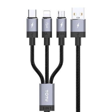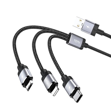 Hendig og robust 3-in-1 kabel med flettet nylon, muliggjør lading og data sync av flere ulike enheter enten med Lightning (8-pin), Micro USB eller Type-C kobling.