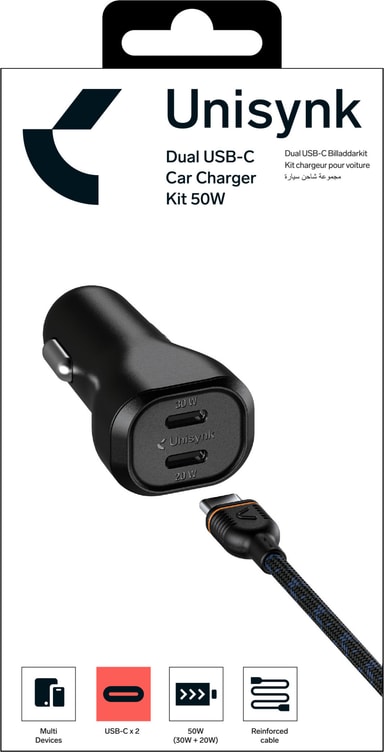 Unisynk 50 W dobbel USB-C billadersett med 50 W gir rask dobbel lading med 30 W og 20 W utganger, universell kompatibilitet og inkluderer en slitesterk, flettet kabel på 1 meter for sømløs strøm på farten.Les mer om produktet