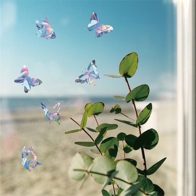 Disse vindus-klistremerkene reflekterer sollys og blir et varselsignal til fugler slik at de ikke flyr inn i vinduer og glassdører og treffer glasset. De fine klistremerkene med sommerfuglmotiver er også en vakker dekorasjon.
