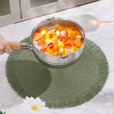 Varmebestandig og bordbeskytter: Nyt roen med den utmerkede varmeisolasjonen disse spisebrikkene gir. De beskytter effektivt bordet ditt mot varme retter og kokekar, og forhindrer stygge brennmerker og bevarer skjønnheten til spiseflaten din.