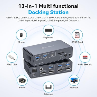 - Antall datamaskiner: Støtte for 2 bærbare datamaskiner med USB-C-porter.