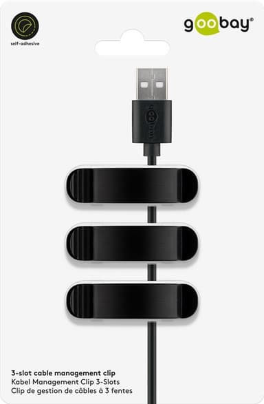 Selvklebende kabelklips kan festes direkte til et skrivebord, skjerm, TV-stativ eller hylle.
