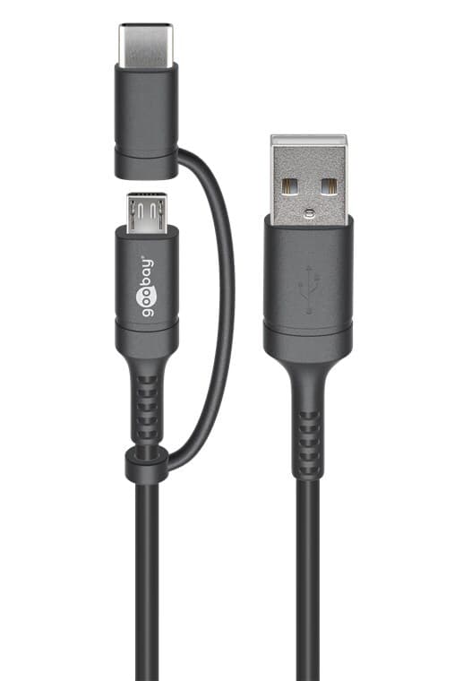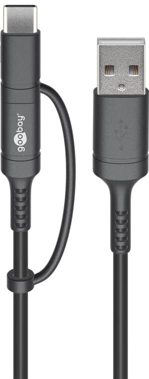Kombinasjonskabel for lading og synkronisering for enheter med Micro-USB og/eller USB-C™-tilkobling. Datakabelen har en Hi-Speed USB-A 2.0-kontakt med en dataoverføringshastighet på opptil 480 Mbit/s og støtter en utgangsstrøm på opptil 2100 mAh.