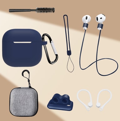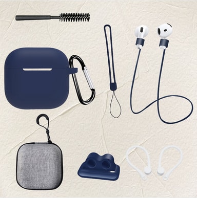 Stilig og funksjonell: Den elegante marineblå fargen gir AirPods et snev av raffinement. Settet inkluderer også en håndleddsstropp for enkel bæring og en rengjøringsbørste for å holde øreproppene dine plettfrie.