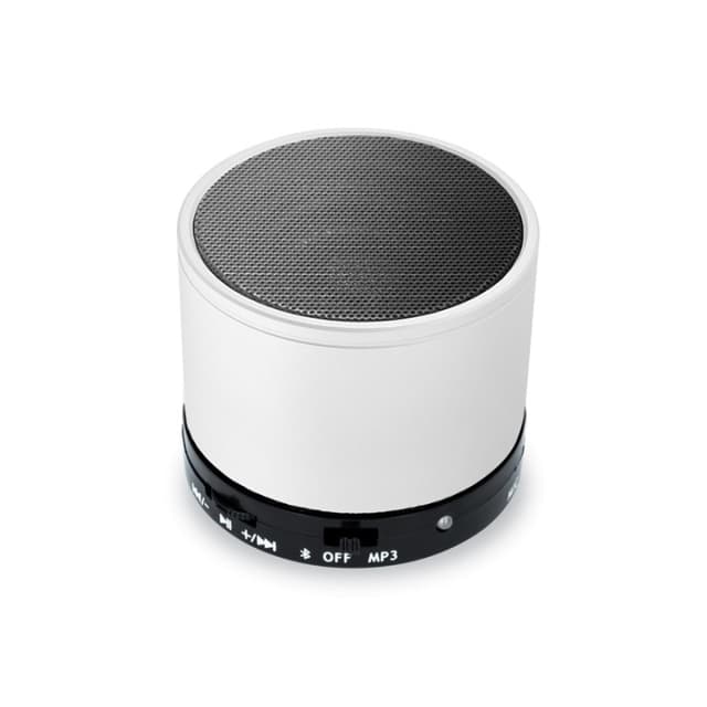 En stilig trådløs Bluetooth-høyttaler i hvitt og svart. Denne praktiske høyttaleren kan enkelt tas med til stranden, på piknik eller på båttur!