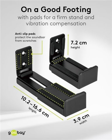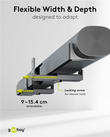 Variabelt justerbar brakett for de fleste vanlige lydplanker opp til en dybde på 90-154 mm, f.eks. fra Samsung, LG, Sonos, Sennheiser, Teufel eller JBL