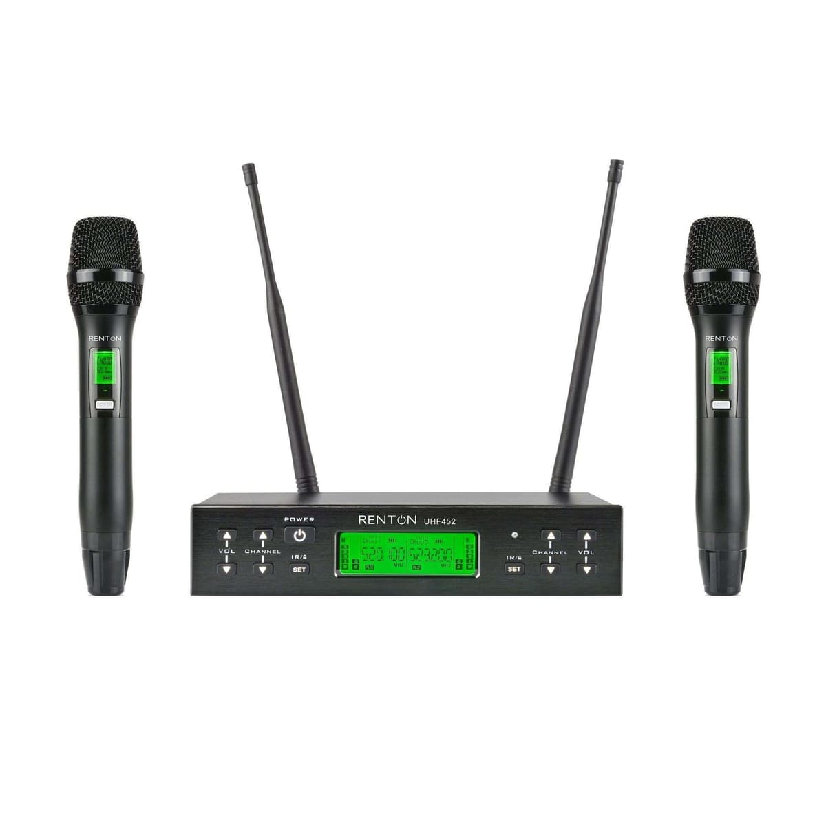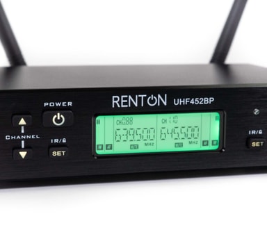Renton Pro Trådløs Mikrofon er et trådløst mikrofonsystem som inkluderer to håndholdte sendere og en dobbel mottaker.